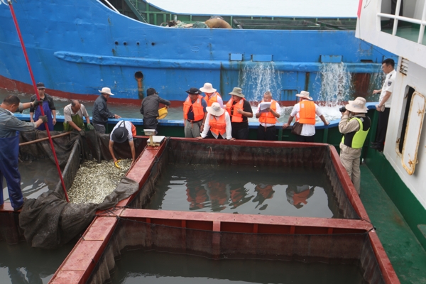 上午9時(shí),增殖放流活動(dòng)正式開始。東臺(tái)公司、東臺(tái)市海洋、公證等部門負(fù)責(zé)人、漁業(yè)技術(shù)專家及漁民代表乘坐漁政船從如東洋口港出發(fā),前往東臺(tái)市145漁區(qū)。省海洋漁業(yè)指揮部、東臺(tái)市漁業(yè)技術(shù)站的專家對(duì)苗種品種、規(guī)格、數(shù)量及質(zhì)量等指標(biāo)進(jìn)行現(xiàn)場(chǎng)檢查,嚴(yán)格把關(guān),保障放流苗種質(zhì)量安全。隨后,工作人員將688.636萬尾大黃魚和大黃魚標(biāo)志魚苗種投放大海,苗種金額達(dá)330萬元,剩余價(jià)值470萬元的苗種,包括半滑舌鰨、黑鯛、菊黃東方鲀、文蛤、大竹蟶等將根據(jù)天氣、潮汐等具體情況于七月底前放流完畢。省沿海開發(fā)集團(tuán)為確保今年增殖放流活動(dòng)的順利進(jìn)行,事先對(duì)放流工作進(jìn)行了周密安排,活動(dòng)細(xì)化到船只、人員、工具等各個(gè)環(huán)節(jié),逐項(xiàng)落實(shí)到位。