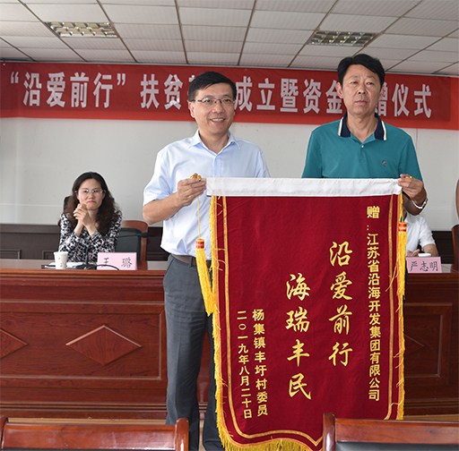 9月5日上午,鄧東升一行參加了“沿愛前行”扶貧基金成立暨資金捐贈(zèng)儀式。鄧東升代表省沿海開發(fā)集團(tuán)向封圩村捐贈(zèng)150萬元成立扶貧濟(jì)困慈善基金,該基金將長(zhǎng)久續(xù)存并持續(xù)產(chǎn)生穩(wěn)定收益,基金權(quán)益及投資收益全部歸屬封圩村,專項(xiàng)用于幫扶封圩村失學(xué)兒童、孤寡老人、殘疾人、因病因?yàn)?zāi)返貧等生活困難的低收入家庭。封圩村向沿海集團(tuán)贈(zèng)送了“沿愛前行、海瑞豐民”錦旗。鄧東升在講話中指出,作為省屬企業(yè)和省“五方掛鉤”成員單位,省沿海開發(fā)集團(tuán)積極貫徹省委省政府“全力打好江蘇精準(zhǔn)脫貧攻堅(jiān)戰(zhàn)”的總體要求,聚焦“兩不愁三保障”目標(biāo),探索建立扶貧長(zhǎng)效機(jī)制,真扶貧、扶真貧;鎮(zhèn)村要嚴(yán)格執(zhí)行基金管理辦法,將每一分錢都花在刀刃上,扶貧濟(jì)困、慈善助學(xué),做到真脫貧、脫真貧,讓封圩村的低收入群體和弱勢(shì)群體有更多的參與感、獲得感和幸福感;沿海集團(tuán)將以此次成立扶貧基金為契機(jī),既“輸血”又“造血”,繼續(xù)加大幫扶力度,鞏固拓展脫貧成果。